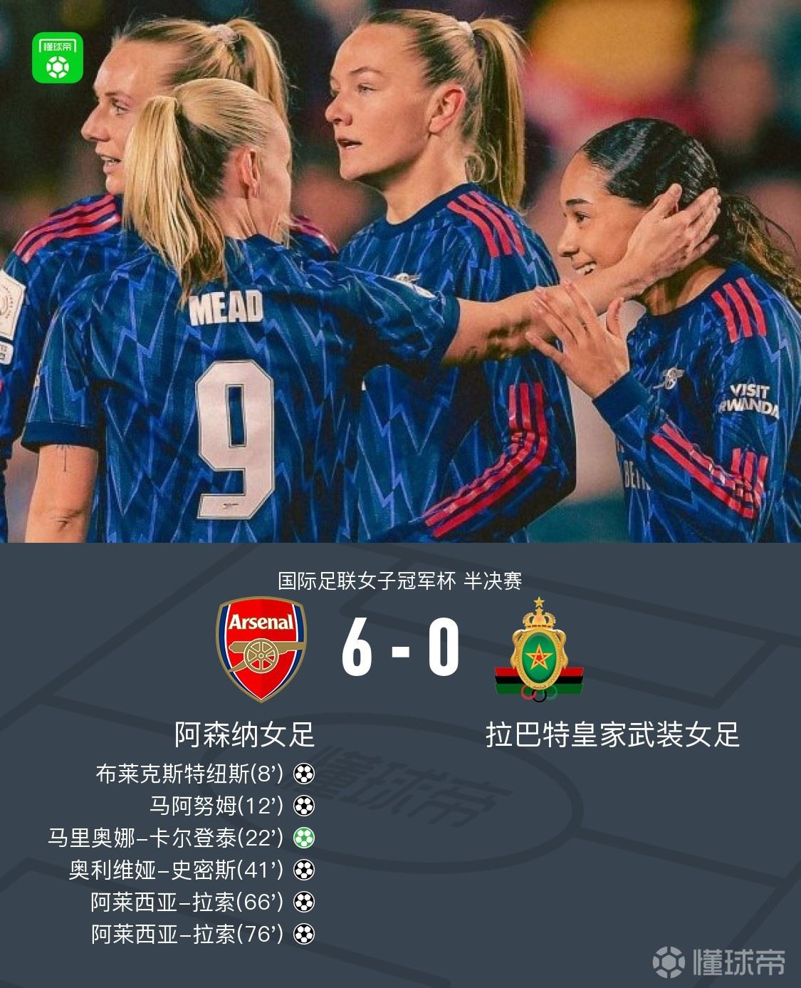 北京时间1月29日,国际足联女子冠军杯半决赛,阿森纳女足对阵拉巴特皇家武装女足。比赛中,阿莱西亚-拉索梅开二度,布莱克斯特纽斯、马阿努姆、马里奥娜-卡尔登泰、奥利维娅-史密斯分别建功。最终,阿森纳女足多点开花6-0大胜拉巴特皇家武装女足,晋级FIFA女冠杯决赛。