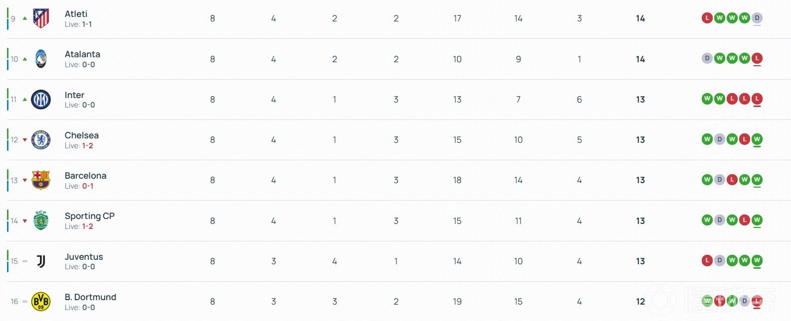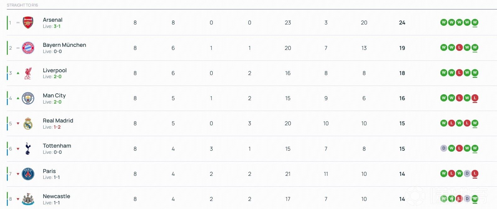 北京时间1月29日,欧冠联赛阶段最后一轮18场比赛全部结束了上半场的争夺。上半场结束后,曼城进入前八名,切尔西掉出前八名。西甲双雄皇马、巴萨目前都暂时落后,分别掉至第5和第13。