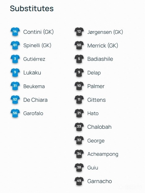 替补:5-巴迪亚西勒、9-德拉普、10-帕尔默、11-吉滕斯、12-约恩森、21-哈托、23-查洛巴、32-乔治、34-阿昌庞、38-吉乌、49-加纳乔、50-梅里克