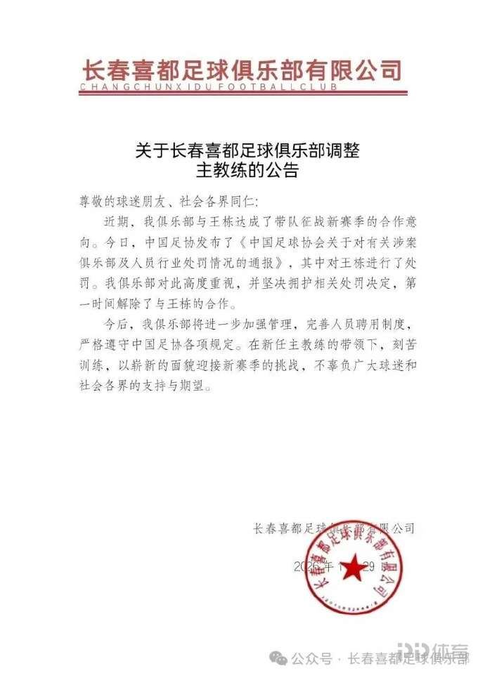 长春喜都官方发布公告,第一时间和王栋解除了合作。