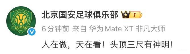 国安被扣5分,并罚款40万元。在公布这一处罚后,北京国安发布官博回应:“人在做,天在看!头顶三尺有神明!”