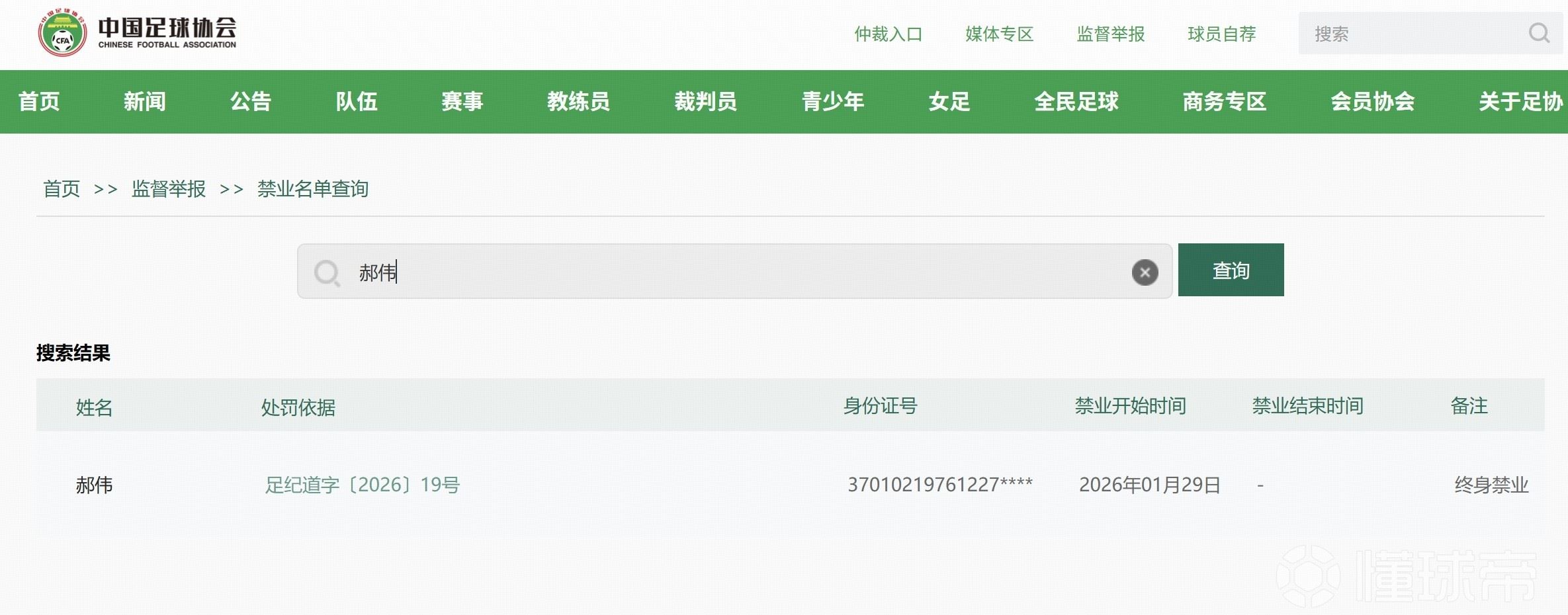 球迷可点击中国足协官网的“监督举报”模块,再点击“禁业名单查询”,输入所查询人员的姓名,就可显示其被禁足的时长和处罚依据等信息。