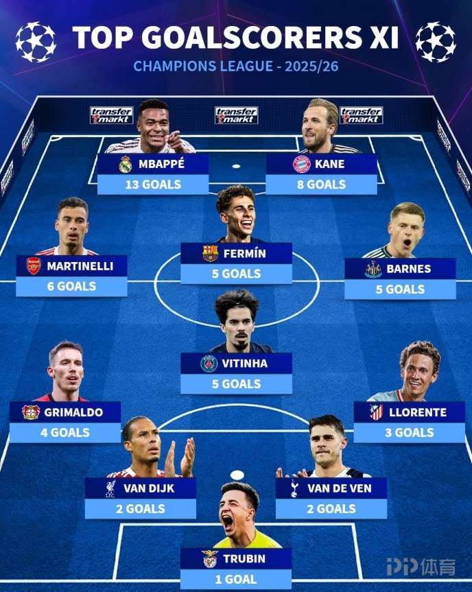 前锋:姆巴佩(皇马,13球)、凯恩(拜仁,8球)