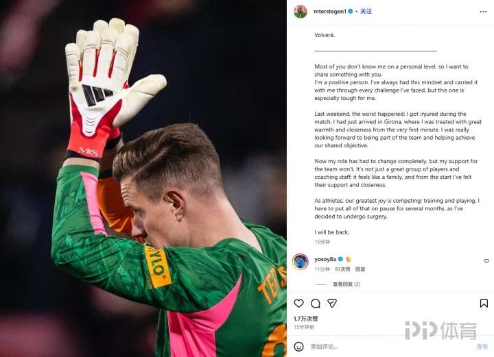 巴萨外租的赫罗纳的门将特尔施特根社媒发文,宣布自己决定接受手术,将伤缺几个月。