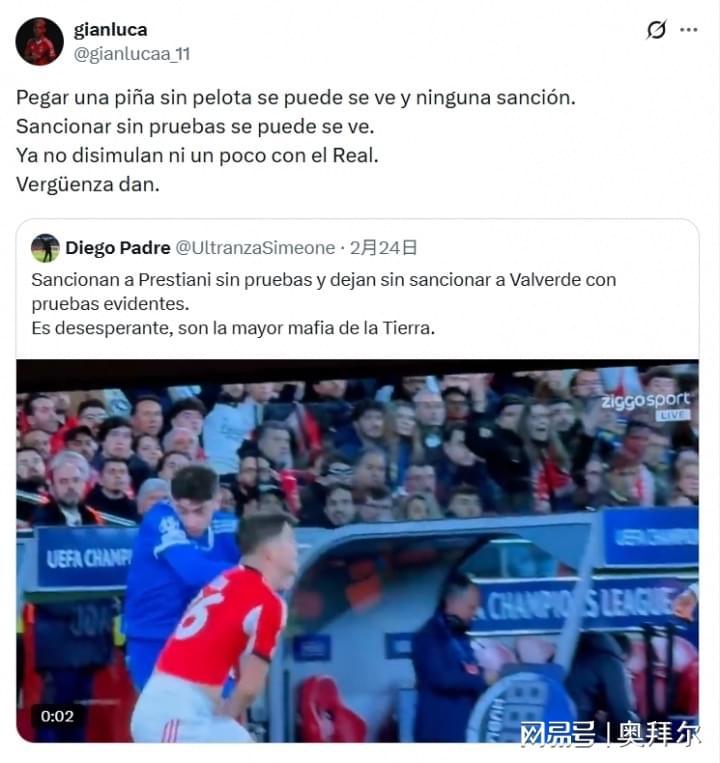 周三,欧足联宣布驳回本菲卡的上诉,维持对普雷斯蒂安尼临时禁赛1场的处罚。普雷斯蒂安尼在社交媒体炮轰欧足联,“毫不掩饰对皇马的偏袒”。