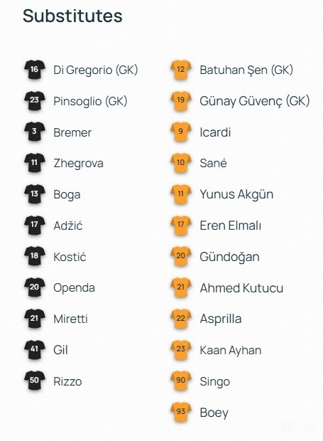 替补:16-迪格雷戈里奥、23-平索利奥、3-布雷默、11-热格罗瓦、13-博加、17-阿季奇、18-科斯蒂奇、20-奥蓬达、21-米雷蒂、41-希尔、50-恩佐