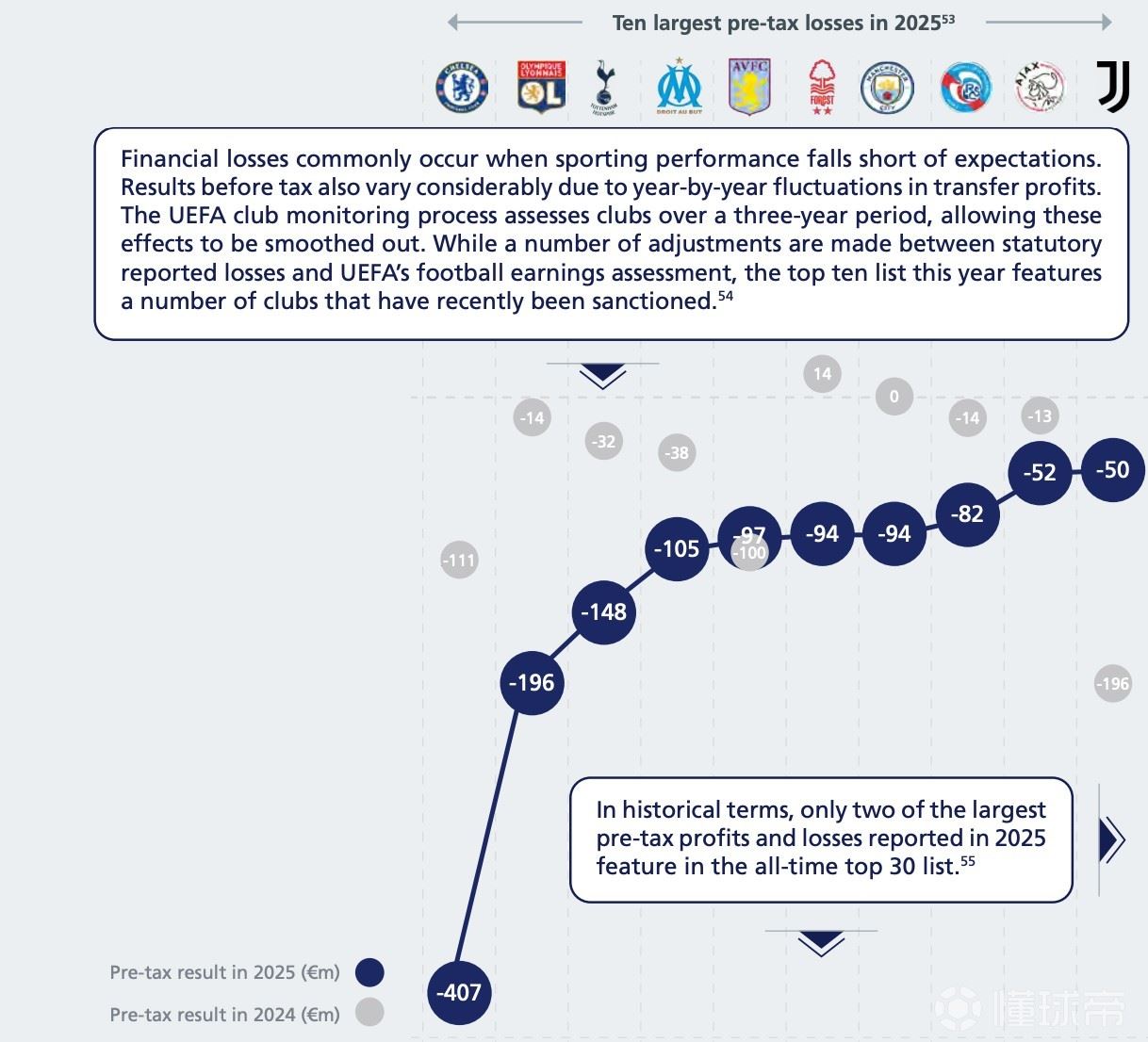 北京时间2月26日,欧足联官方发布了一份名为《欧洲俱乐部与投资格局》的文件,其中他们列出了2025年税前亏损最多的10家欧洲俱乐部,切尔西亏损4.07亿欧元,远超其他任何俱乐部,前10名中英超占据五席。
