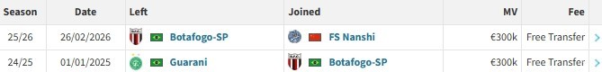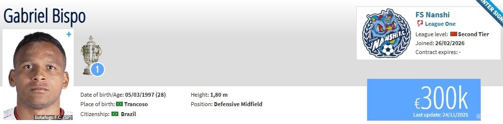 北京时间2月26日,德转更新,巴西中场加布里埃尔-比斯波自由身加盟佛山南狮,身价30万欧。