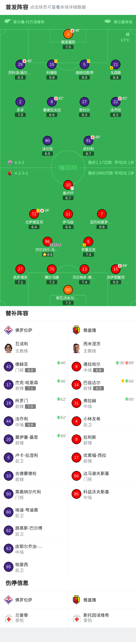 第23分钟,马祖雷克低射被扑,门前补射打破僵局,佛罗伦萨0-1雅盖隆