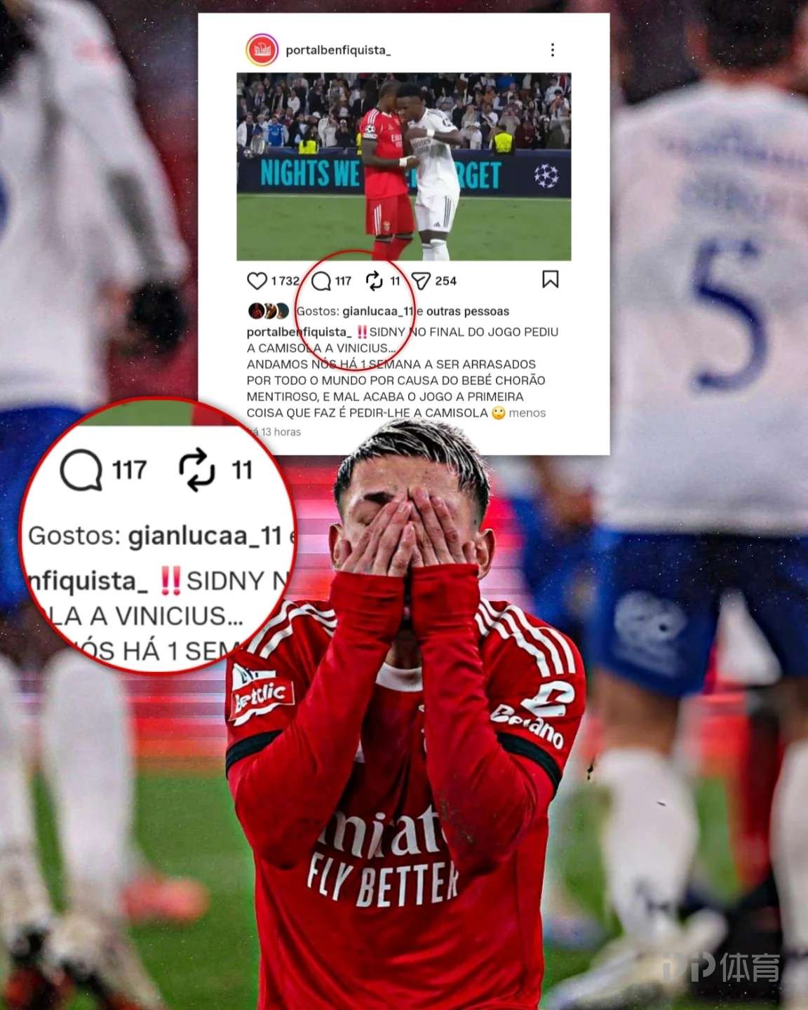 本菲卡球迷组织发帖称:“赛后卡布拉尔向维尼修斯索要球衣……过去一周,我们因那个爱哭又撒谎的“巨婴”被全世界疯狂嘲讽,结果比赛刚一结束,他做的第一件事就是向对方索要球衣。”