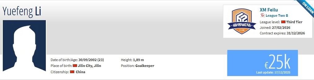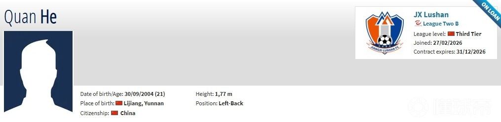 德转更新,天津津门虎门将李岳峰租借加盟厦门飞鹭,上海申花后卫和泉租借加盟江西庐山。