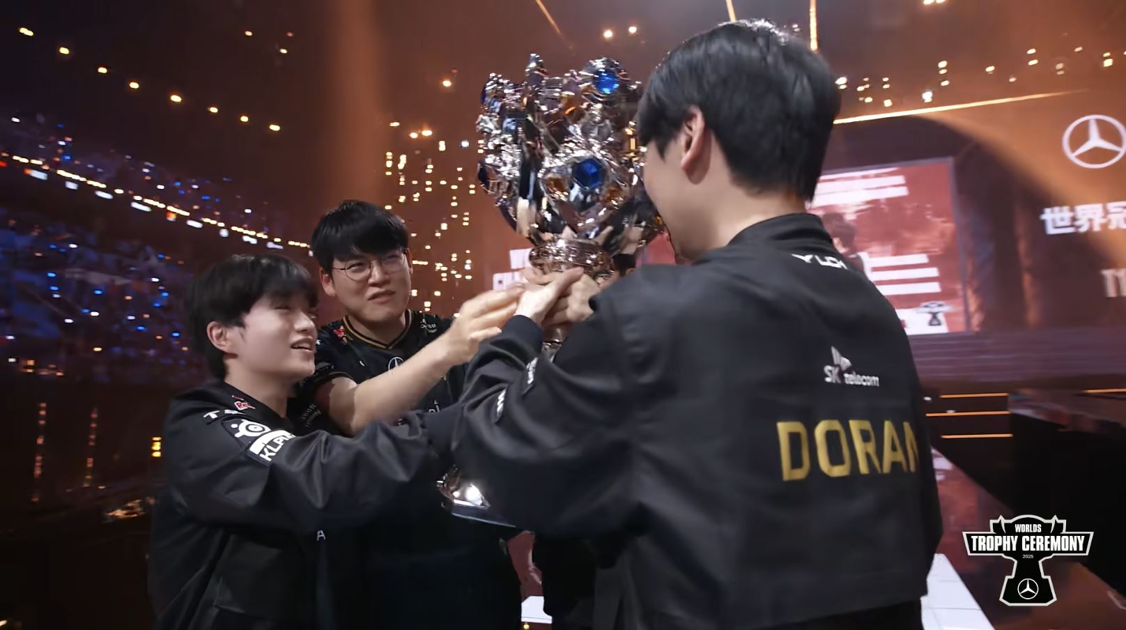 第五局游戏Oner的一次三级变奏养出了前期超肥的青钢影,也完全打废了KT的掘墓。虽然在后续的团战中,Doran青钢影多次给出机会,但Bdd双拳难敌十手,T1赢下决胜局,赢得2025世界赛冠军的同时,成就了历史首次三连冠!