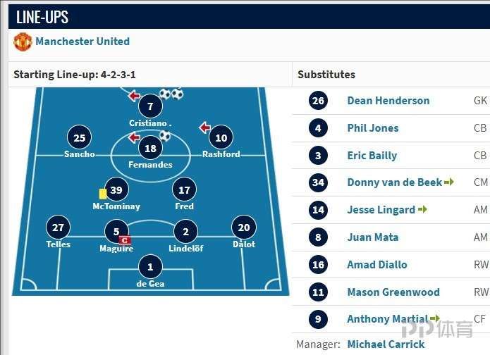 替补席则是:迪恩·亨德森、菲尔·琼斯、拜利、范德贝克、林加德、马塔、阿玛德、格林伍德、马夏尔。