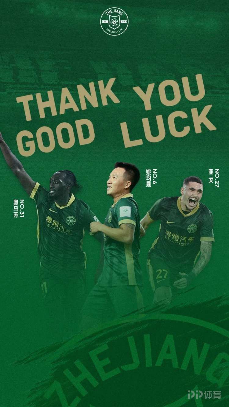 近期,经与球员本人友好协商并达成一致,浙江职业足球俱乐部与球员姚均晟、奥乌苏在合同期满后不再续约,球员亚戈租借期满后返回蔚山现代。