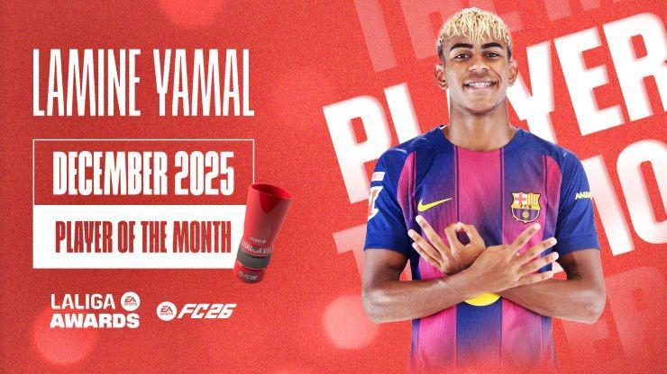 • 官方:巴萨前锋亚马尔当选西甲12月最佳球员