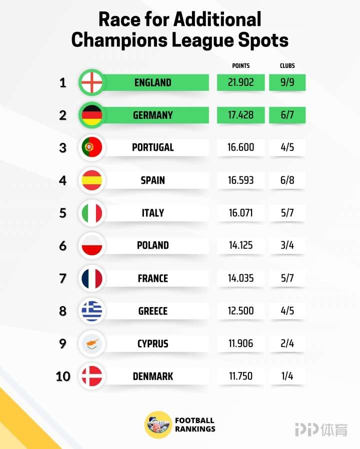 • 欧战系数:英格兰9队征战锁定前二 拿下第5个欧冠名额