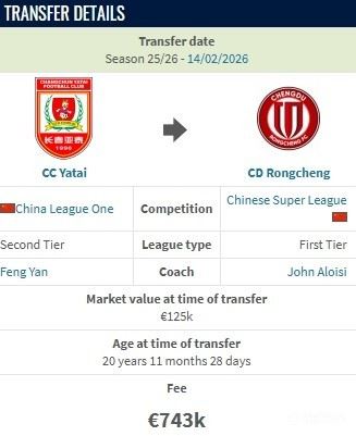 • 德转:贺一然从长春亚泰加盟成都蓉城的转会费约600万人民币