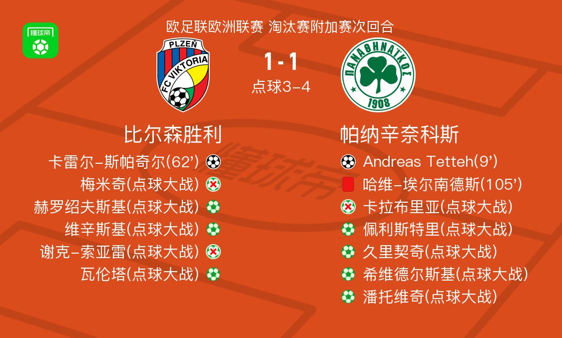 • 点球大战帕纳辛奈科斯5-4比尔森胜利,谢克-索亚雷失点