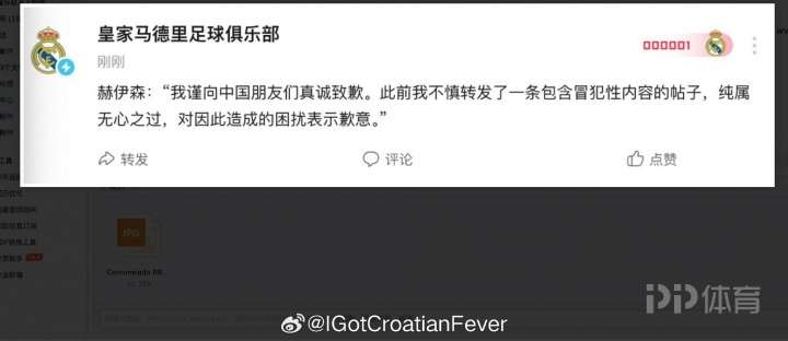• 皇马就赫伊森事件,邮件回复中国球迷:球员已通过中国社媒道歉